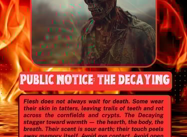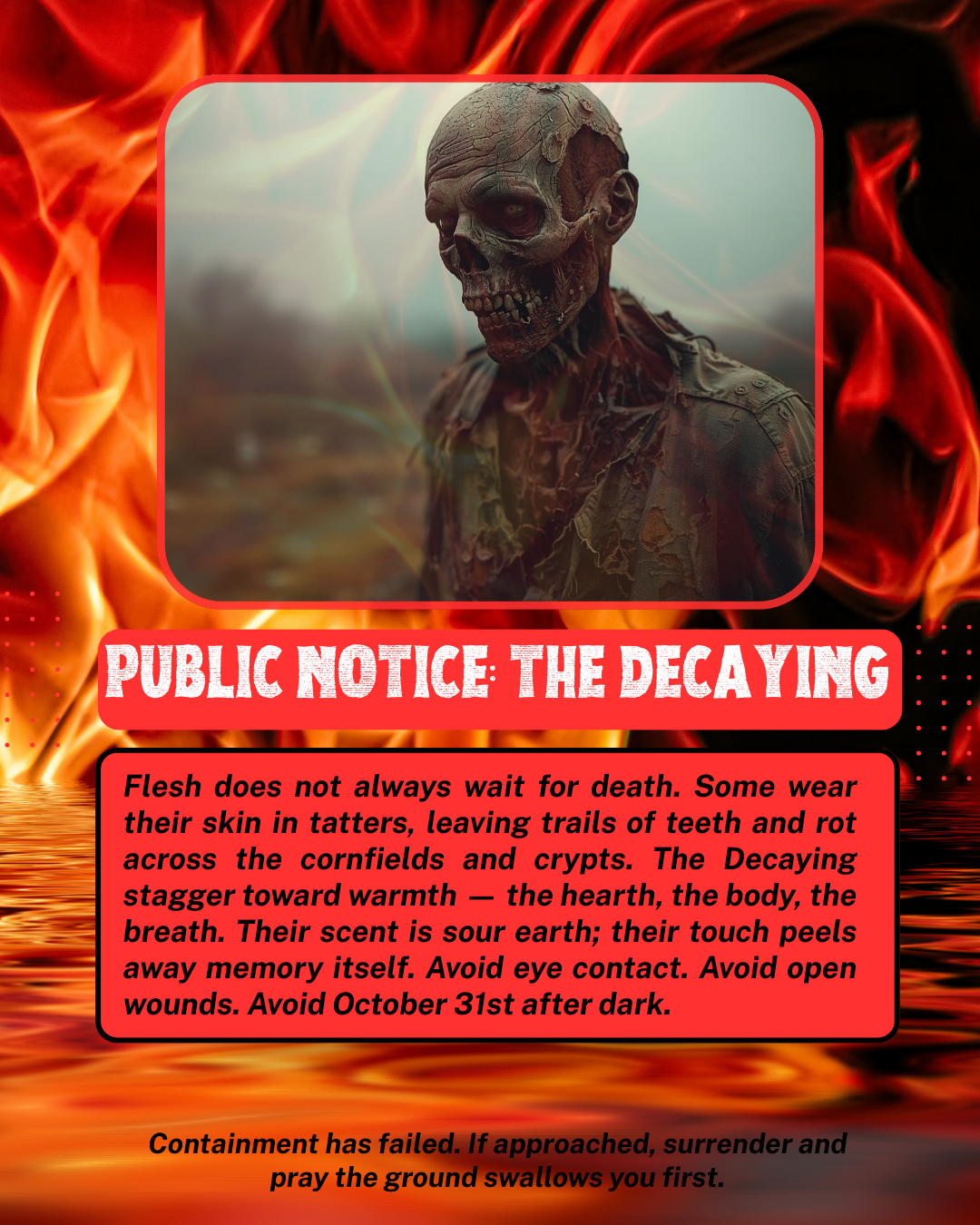 “Recovered from bulletin boards across Fresno County. Each poster was stapled up, torn down, and reappeared somewhere else — the ink never smudges, the paper never fades. The Archivist catalogued them under four themes: Damned, Dead, Decayed, and Missing.”
